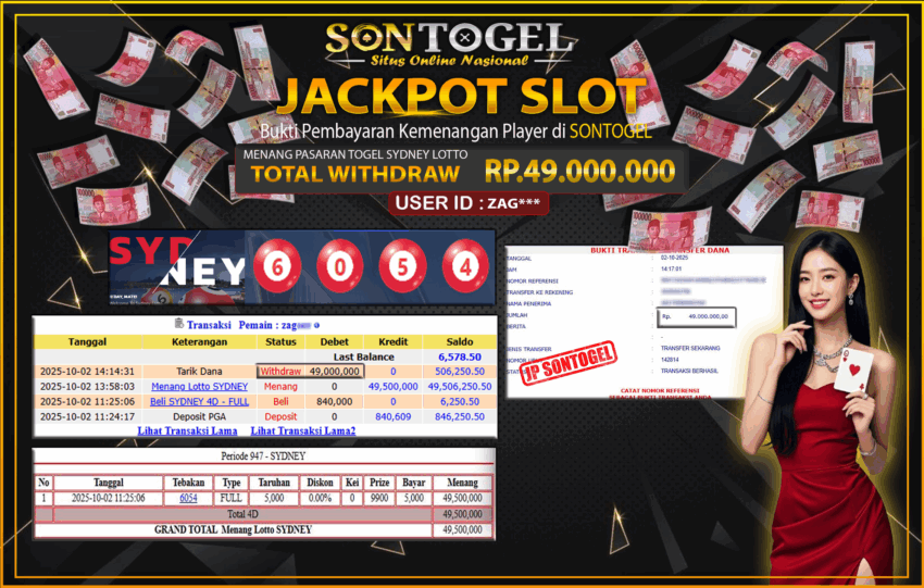 Selamat Kepada Member SONTOGEL dengan USER ID : ZAG*** PASARAN TOGEL SYDNEY LOTTO sebesar RP.49.000.000,- LUNAS langsung di transfer ke rekening member tanpa kurang sepeserpun. Terimakasih telah mempercayakan SONTOGEL sebagai Situs Online Terpercaya dan Aman! Jangan tunggu tunggu lagi! langsung saja daftarkan akun bermain di SONTOGEL dan dapatkan bonus berlimpah setiap minggunya.