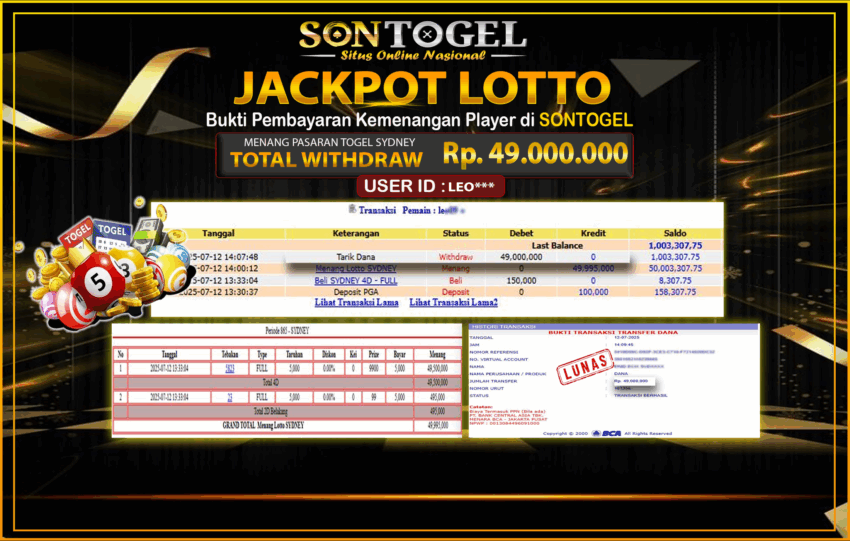 Selamat Kepada Member SONTOGEL dengan USER ID :LEO*** PASARAN TOGEL SYDNEY sebesar RP.49.000.000,- LUNAS langsung di  transfer ke rekening member tanpa kurang sepeserpun. Terimakasih telah mempercayakan SONTOGEL sebagai Situs Online Terpercaya dan Aman! Jangan tunggu tunggu lagi! langsung saja daftarkan akun bermain di SONTOGEL dan dapatkan bonus berlimpah setiap minggunya.