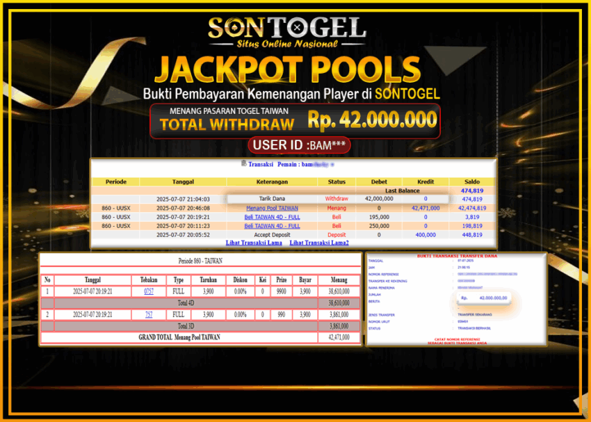 Berikut ini adalah BUKTI JP SONTOGEL yang sudah diproseskan ke rekening member kami