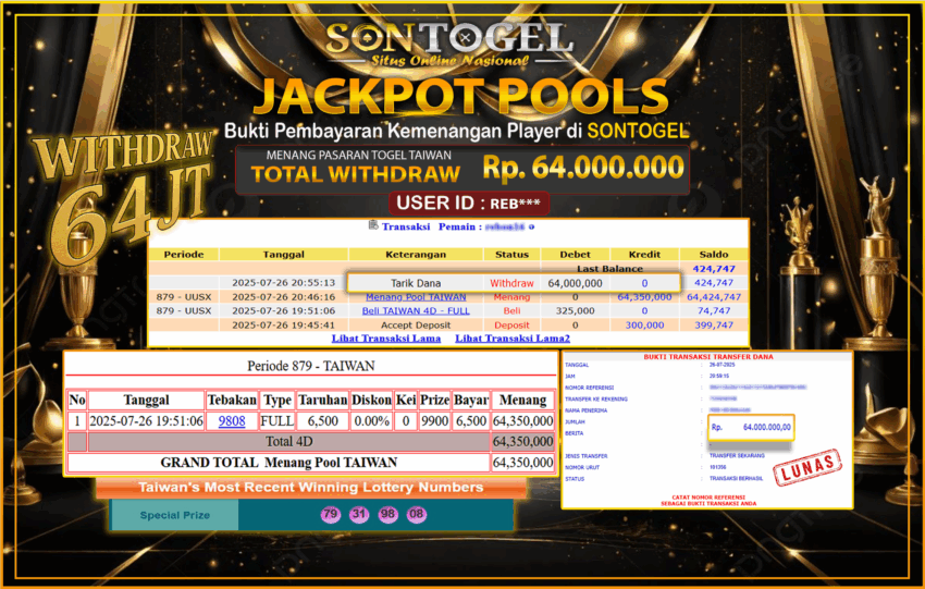 Selamat Kepada Member SONTOGEL dengan USER ID :REB*** PASARAN TOGEL TAIWAN sebesar RP.64.000.000,- LUNAS langsung di transfer ke rekening member tanpa kurang sepeserpun. Terimakasih telah mempercayakan SONTOGEL sebagai Situs Online Terpercaya dan Aman! Jangan tunggu tunggu lagi! langsung saja daftarkan akun bermain di SONTOGEL dan dapatkan bonus berlimpah setiap minggunya.