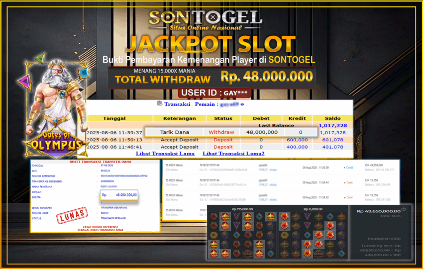 Selamat Kepada Member SONTOGEL dengan USER ID : GAY*** SLOT 15.000X MANIA di SLOT MANIA Play sebesar RP.48.000.000,- LUNAS langsung di  transfer ke rekening member tanpa kurang sepeserpun. Terimakasih telah mempercayakan SONTOGEL sebagai Situs Online Terpercaya dan Aman! Jangan tunggu tunggu lagi! langsung saja daftarkan akun bermain di SONTOGEL dan dapatkan bonus berlimpah setiap minggunya.