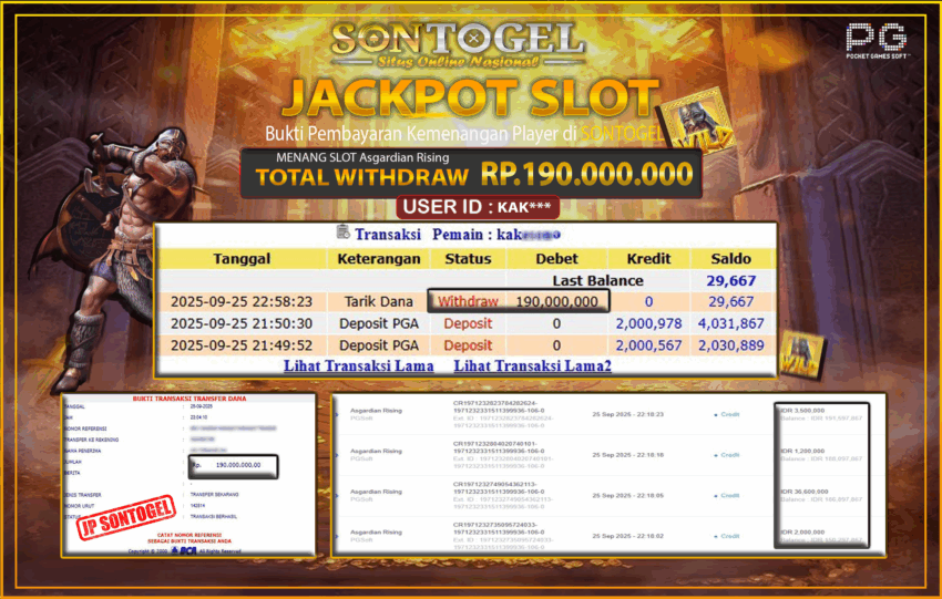 Selamat Kepada Member SONTOGEL dengan USER ID : KAK*** SLOT ASGARDIAN RISING di provider PG Soft sebesar RP.190.000.000,- LUNAS langsung di  transfer ke rekening member tanpa kurang sepeserpun. Terimakasih telah mempercayakan SONTOGEL sebagai Situs Online Terpercaya dan Aman! Jangan tunggu tunggu lagi! langsung saja daftarkan akun bermain di SONTOGEL dan dapatkan bonus berlimpah setiap minggunya.