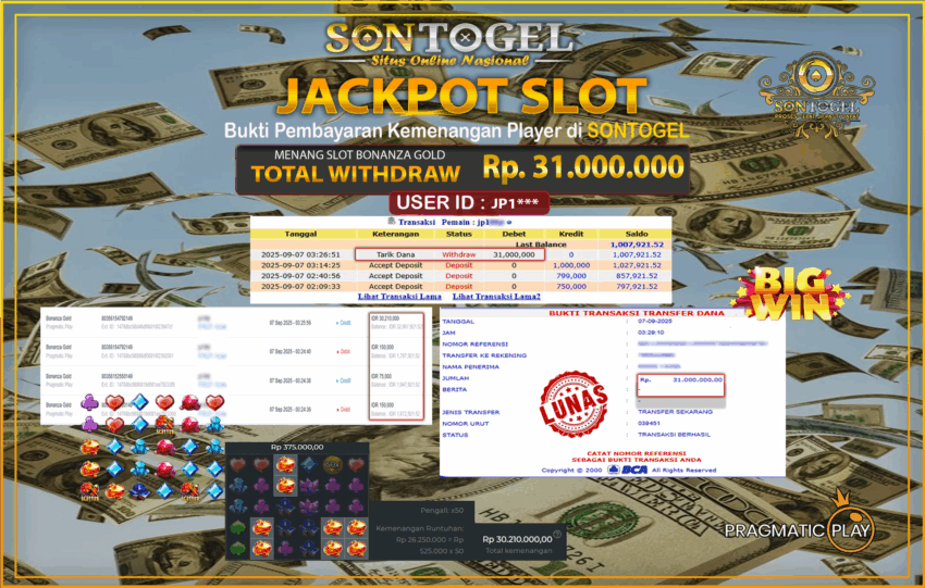 JP SONTOGEL SLOT BONANZA GOLD Rp.31.000.000