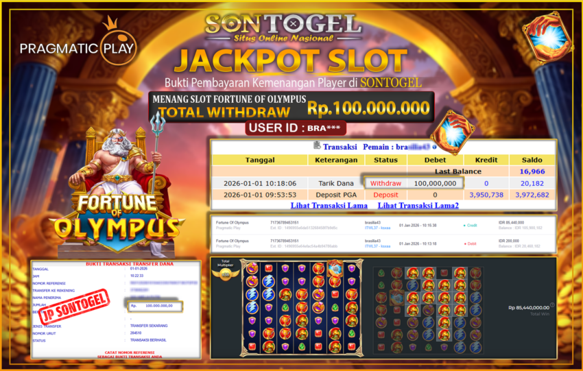 Selamat Kepada Member SONTOGEL dengan USER ID : BRA*** SLOT FORTUNE OF OLYMPUS di provider Pragmatic Play sebesar RP.100.000.000,- LUNAS langsung di transfer ke rekening member tanpa kurang sepeserpun. Terimakasih telah mempercayakan SONTOGEL sebagai Situs Online Terpercaya dan Aman! Jangan tunggu tunggu lagi! langsung saja daftarkan akun bermain di SONTOGEL dan dapatkan bonus berlimpah setiap minggunya.