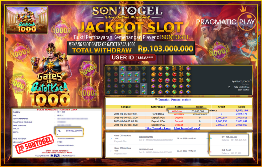 Selamat Kepada Member SONTOGEL dengan USER ID : USA*** SLOT GATES OF GATOT KACA 1000 di Pragmatic Play sebesar RP.38.500.000,- LUNAS langsung di transfer ke rekening member tanpa kurang sepeserpun. Terimakasih telah mempercayakan SONTOGEL sebagai Situs Online Terpercaya dan Aman! Jangan tunggu tunggu lagi! langsung saja daftarkan akun bermain di SONTOGEL dan dapatkan bonus berlimpah setiap minggunya.