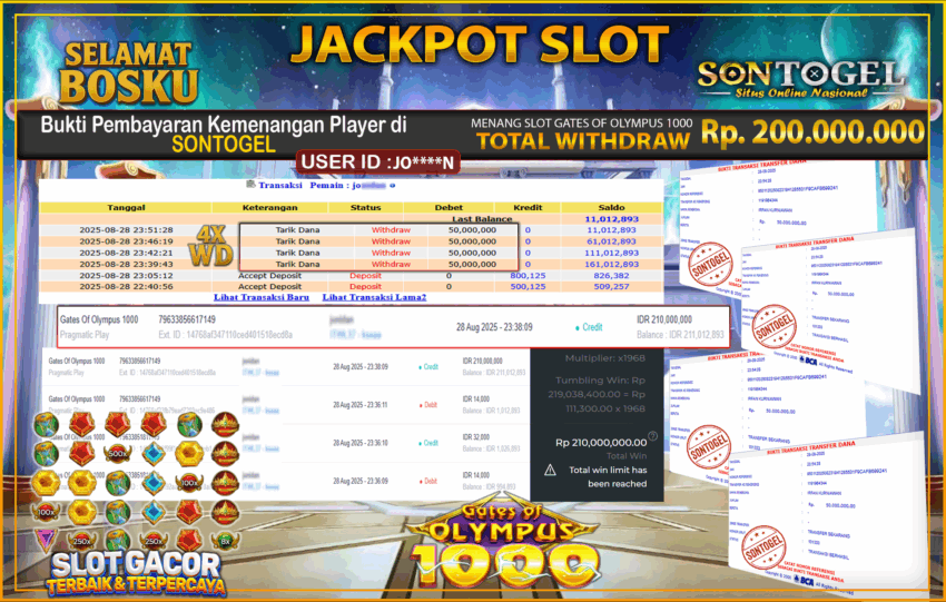 Selamat Kepada Member SONTOGEL dengan USER ID : JON*** SLOT GATES OF OLYMPUS 1000 di Pragmatic Play sebesar RP.200.000.000,- LUNAS langsung di transfer ke rekening member tanpa kurang sepeserpun. Terimakasih telah mempercayakan SONTOGEL sebagai Situs Online Terpercaya dan Aman! Jangan tunggu tunggu lagi! langsung saja daftarkan akun bermain di SONTOGEL dan dapatkan bonus berlimpah setiap minggunya.