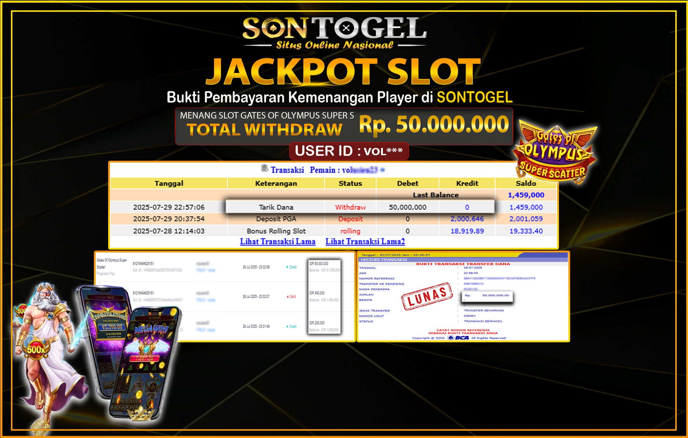 Selamat Kepada Member SONTOGEL dengan USER ID : VOL*** SLOT GATES OF OLYMPUS SUPER SCATER di provider Pragmatic Play sebesar RP.50.000.000,- LUNAS langsung di transfer ke rekening member tanpa kurang sepeserpun. Terimakasih telah mempercayakan SONTOGEL sebagai Situs Online Terpercaya dan Aman! Jangan tunggu tunggu lagi! langsung saja daftarkan akun bermain di SONTOGEL dan dapatkan bonus berlimpah setiap minggunya.