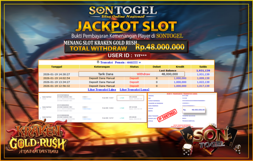 Selamat Kepada Member SONTOGEL dengan USER ID : TIT*** SLOT KRAKEN GOLD RUSH BUKTI JP SONTOGEL – Situs Togel Online, Live Casino dan Slot Online Terpercaya yang terbukti membayar berapapun kemenangan Anda tanpa kekurangan sepeserpun. Jika Anda masih mencari Situs Terpercaya, jangan ragu untuk bermain di SONTOGEL. Dalam 1 akun Anda bisa menikmati semua permainan dengan minimal deposit hanya Rp. 5.000,- saja.