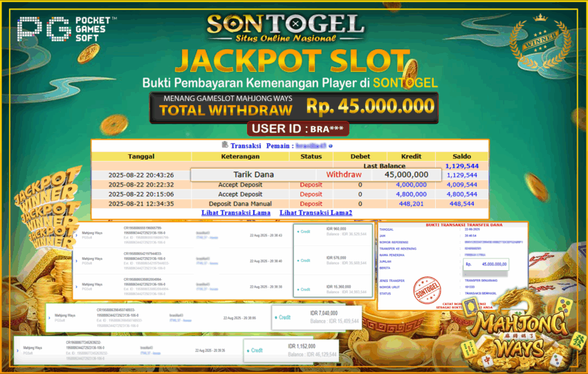 Selamat Kepada Member SONTOGEL dengan USER ID : BRA*** SLOT MAHJONG WAYSdi G Soft sebesar RP.45.000.000,- LUNAS langsung di transfer ke rekening member tanpa kurang sepeserpun. Terimakasih telah mempercayakan SONTOGEL sebagai Situs Online Terpercaya dan Aman! Jangan tunggu tunggu lagi! langsung saja daftarkan akun bermain di SONTOGEL dan dapatkan bonus berlimpah setiap minggunya.