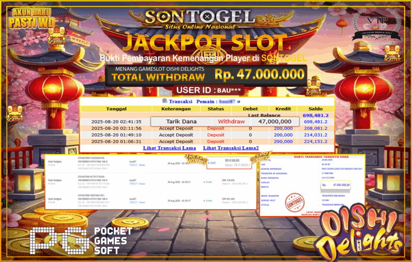 Selamat Kepada Member SONTOGEL dengan USER ID : BAU*** SLOT OISHI DELIGHTS di PG Soft sebesar RP.47.000.000,- LUNAS langsung di  transfer ke rekening member tanpa kurang sepeserpun. Terimakasih telah mempercayakan SONTOGEL sebagai Situs Online Terpercaya dan Aman! Jangan tunggu tunggu lagi! langsung saja daftarkan akun bermain di SONTOGEL dan dapatkan bonus berlimpah setiap minggunya.