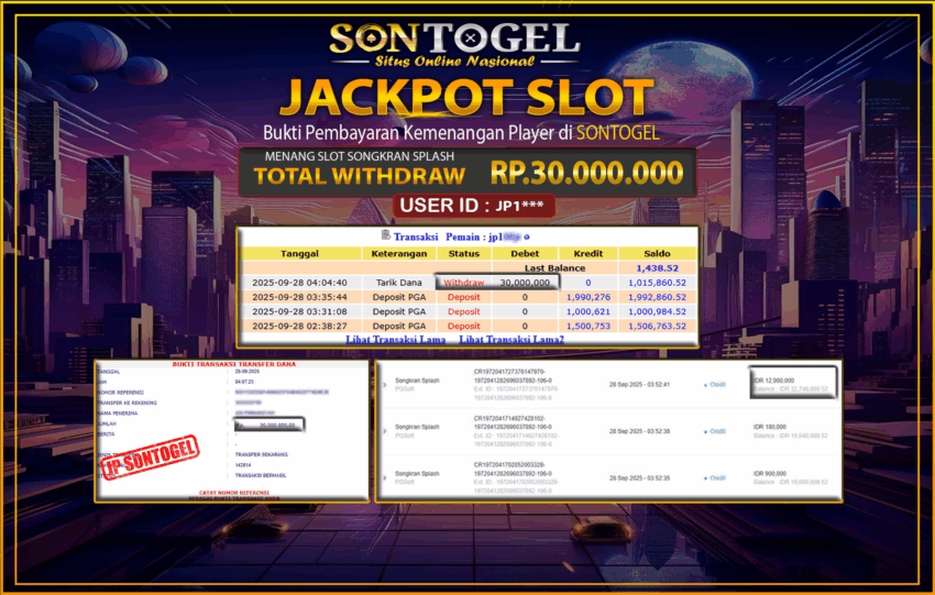 BUKTI JP SONTOGEL – Situs Togel Online, Live Casino dan Slot Online Terpercaya yang terbukti membayar berapapun kemenangan Anda tanpa kekurangan sepeserpun. Jika Anda masih mencari Situs Terpercaya, jangan ragu untuk bermain di SONTOGEL. Dalam 1 akun Anda bisa menikmati semua permainan dengan minimal deposit hanya Rp. 5.000,- saja.
