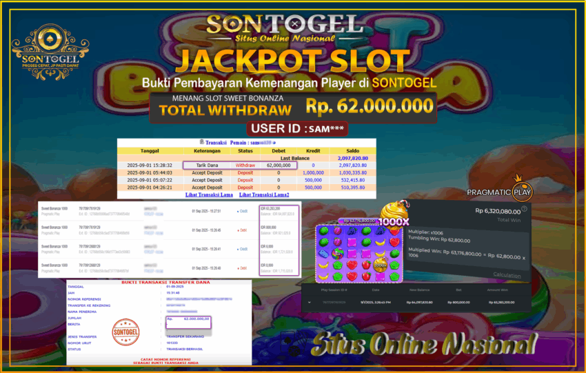 Selamat Kepada Member SONTOGEL dengan USER ID : SAM*** SLOT SWEET BONANZA di PRAGMATIC sebesar RP.62.000.000,- LUNAS langsung di  transfer ke rekening member tanpa kurang sepeserpun. Terimakasih telah mempercayakan SONTOGEL sebagai Situs Online Terpercaya dan Aman! Jangan tunggu tunggu lagi! langsung saja daftarkan akun bermain di SONTOGEL dan dapatkan bonus berlimpah setiap minggunya.