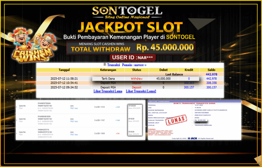 Selamat Kepada Member SONTOGEL dengan USER ID : NAR*** SLOT CAISHEN WINS di provider Pragmatic Play sebesar RP.45.000.000,- LUNAS langsung di  transfer ke rekening member tanpa kurang sepeserpun. Terimakasih telah mempercayakan SONTOGEL sebagai Situs Online Terpercaya dan Aman! Jangan tunggu tunggu lagi! langsung saja daftarkan akun bermain di SONTOGEL dan dapatkan bonus berlimpah setiap minggunya.